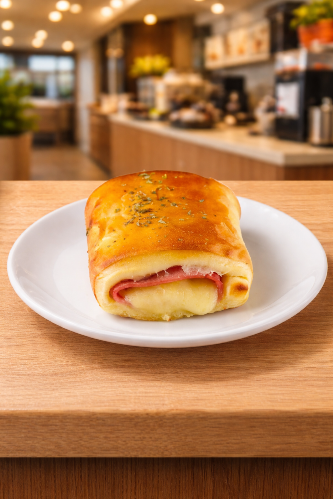 Massa macia e assada no ponto certo. Recheio generoso de presunto, mussarela derretida, oregano e tomates. Sabor de pizza em um lanche prático e irresistivel!